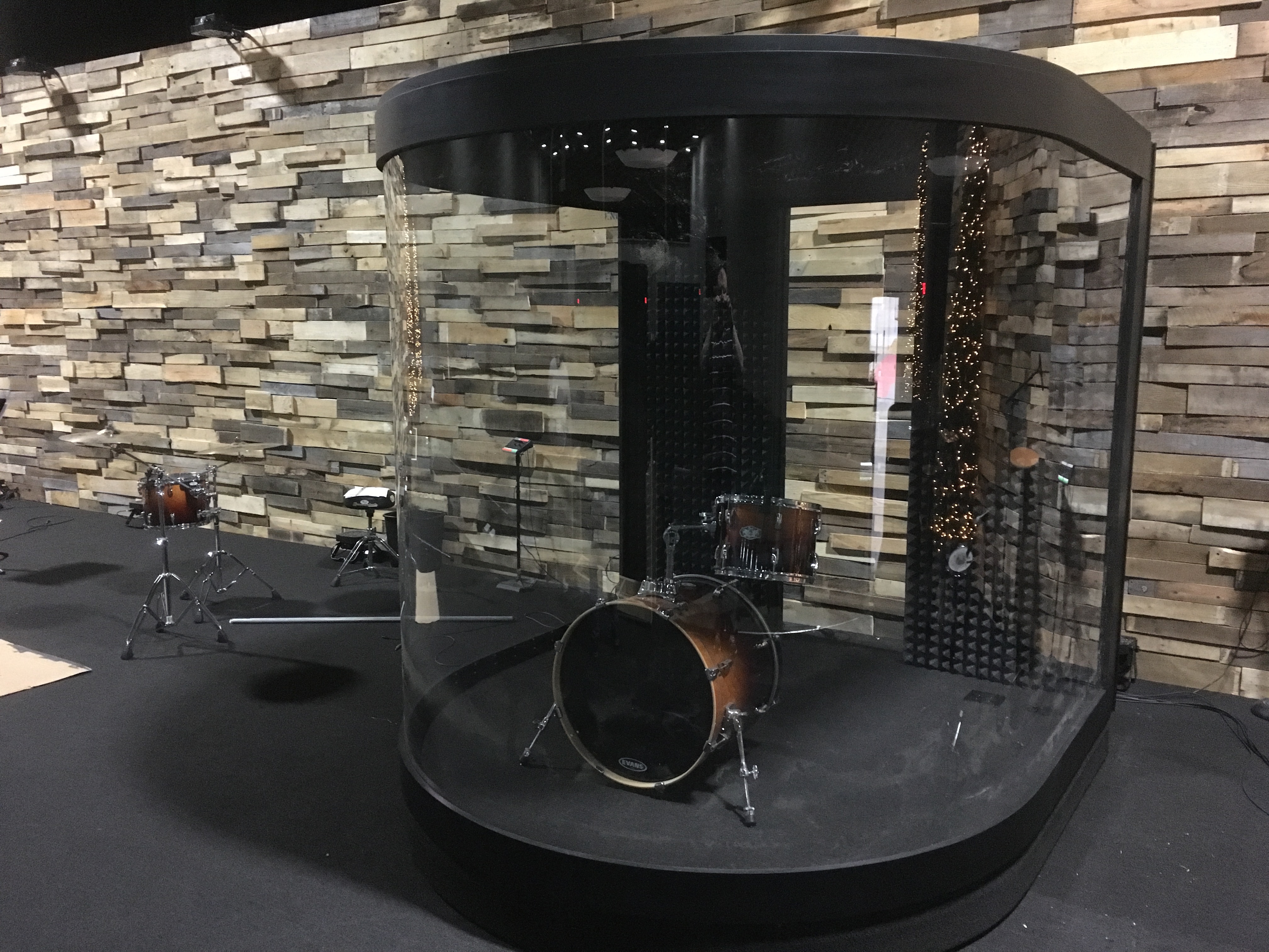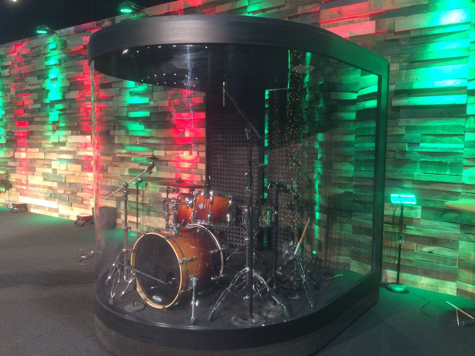 We recently built a custom drum enclosure (drum cage) that is completely enclosed with a full glass front. We gathered ideas from others that have built similar enclosures and custom built this to our needs.